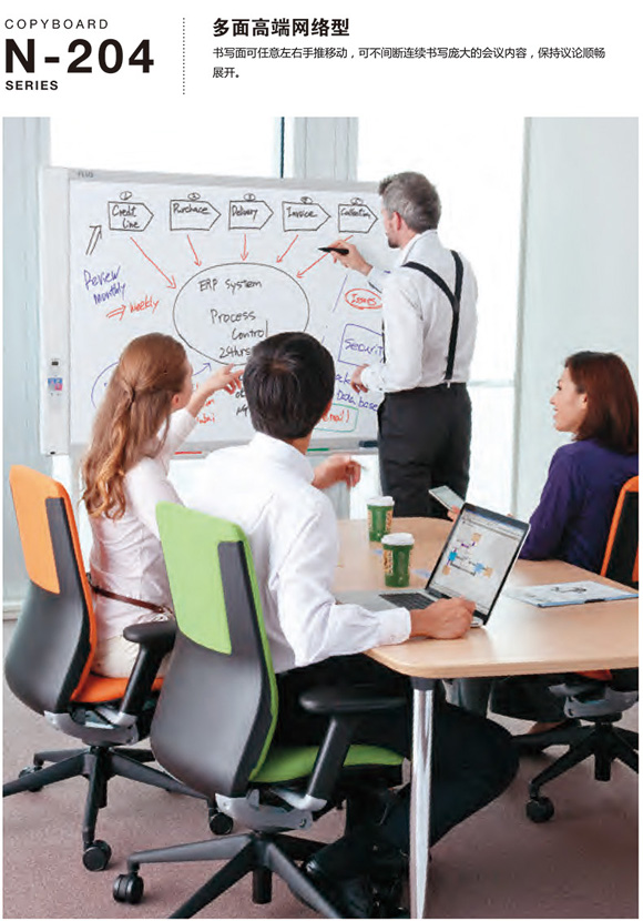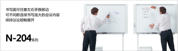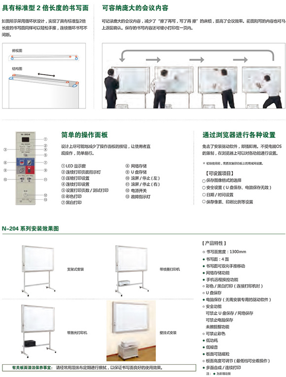 普通纸网络型 N-204S(彩色打印) 4幅书写面,可任意左右手推移动,可不间断连续书写庞大的会议内容,保持议论顺畅展开。 1. 超薄——使用不拘场所 2. 轻量——移动方便的设计 3. 不妨碍讨论的手推功能 4. 具有标准型2倍长度的书写面 5. 方便的压缩打印功能 6. 可容纳庞大的会议内容 7. 可贴磁粒 8. 脚架高度可调节 9. 扫描时间缩短 10. 静音设计 11. 一键直观操作 12. 未擦提醒功能 13. 电力消耗降低 14. 输出 15. USB插口设置到正面 16. 保存格式有3种 17. 降低信息泄露风险 18. 可设置禁止彩色打印 19. 无需安装专用软件,及插即用 20. 网络存储功能 21. 直接保存到电脑 22. 安全功能