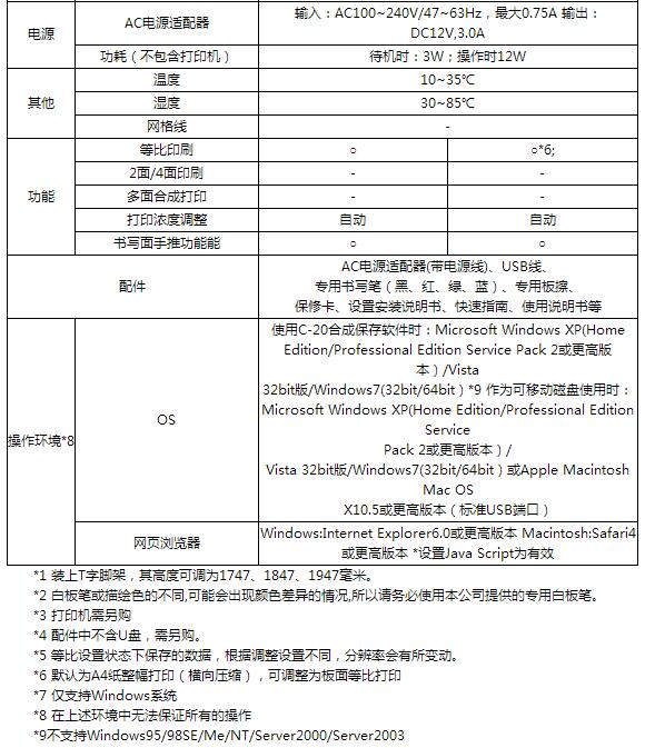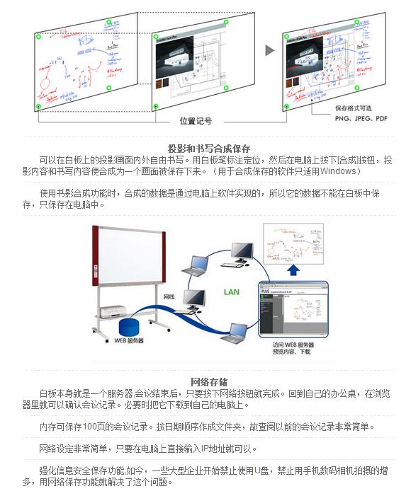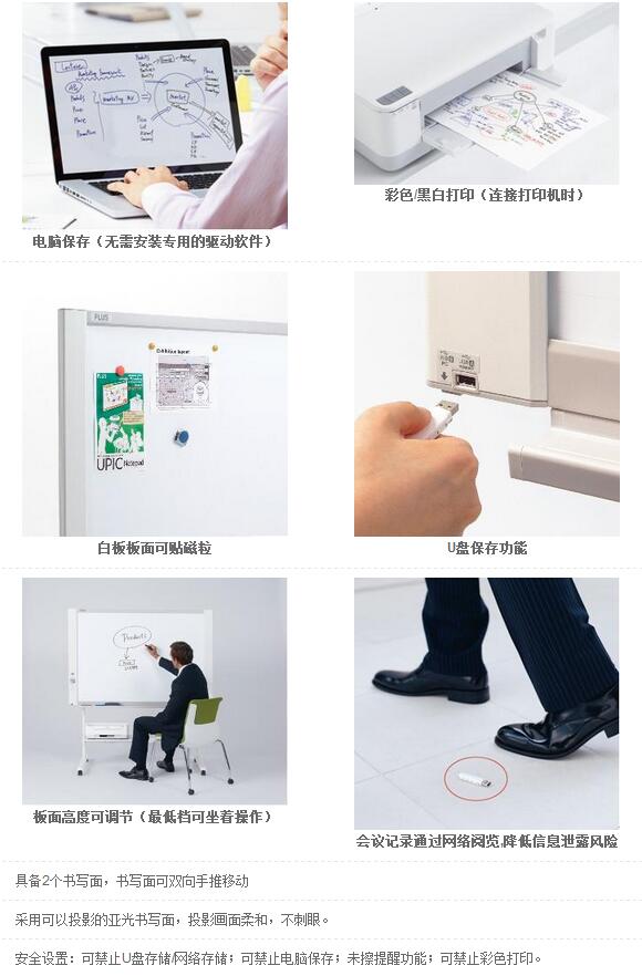 书影合成普通纸 C20S(彩色打印) 在投影画面上可用白板笔标注,投影画面和标注通过合成可用图片形式完整保存。 在确认修改图纸、演讲材料时威力无穷。作为复印白板也同样发挥功效。 1. 超薄——使用不拘场所 2. 厚度减少了4成的时尚设计 3. 轻量——移动方便的设计 4. 投影和书写合成保存 5. 不妨碍讨论的手推功能 6. 可贴磁粒 7. 脚架高度可调节 8. 扫描时间缩短 9. 静音设计 10. 一键直观操作 11. 未擦提醒功能 12. 电力消耗降低 13. 记录内容分发 14. USB插口设置到正面 15. 保存格式有3种 16. 降低信息泄露风险 17. 可设置禁止彩色打印 18. 无需安装专用软件,即插即用 19. 网络存储功能 20. 直接保存到电脑 21. 安全功能 22. 亚光书写面 23. 可详细设置打印模板